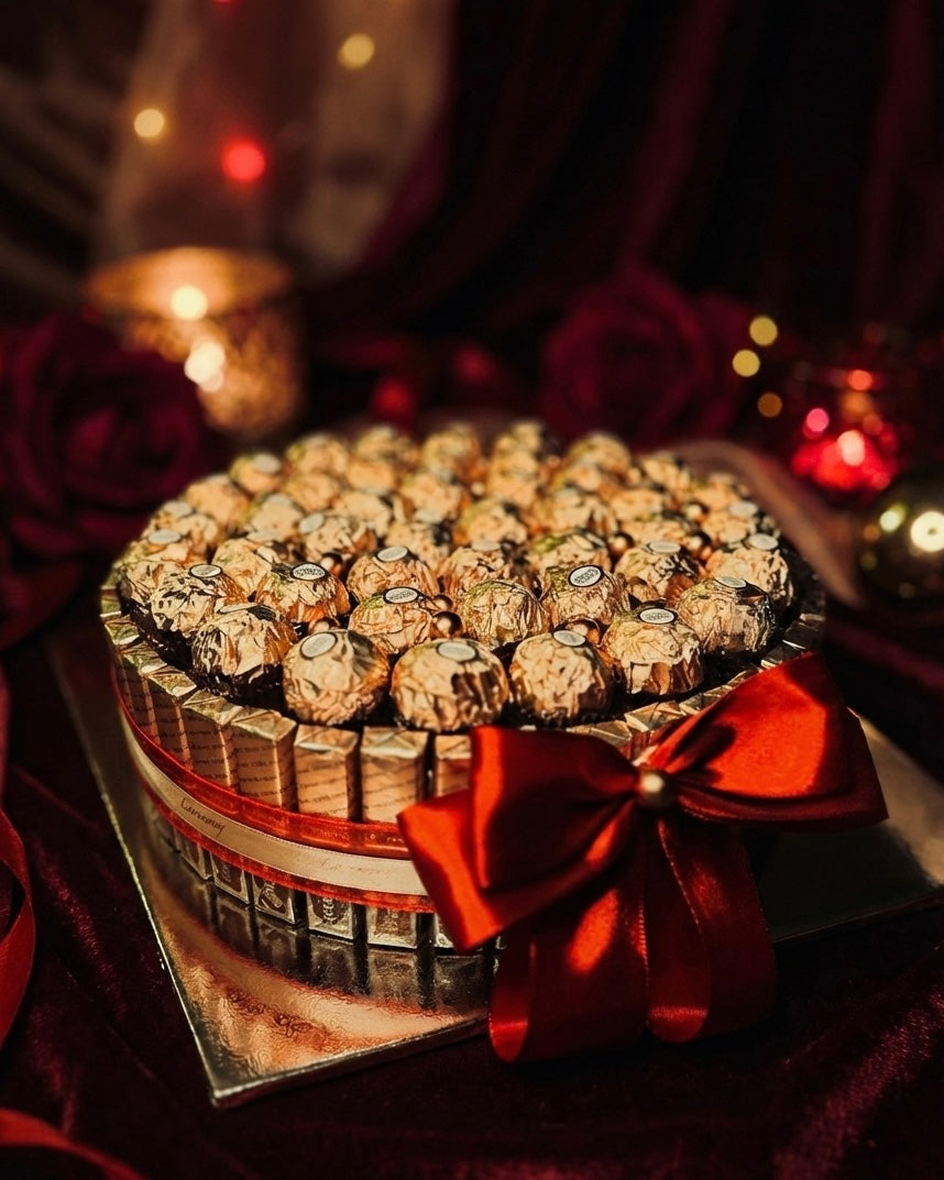 An irresistible fusion of elegance and indulgence, this handcrafted chocolate cake is adorned with Merci bars around the base and crowned with Ferrero Rocher, finished with golden décor balls and a satin ribbon wrap. A true centerpiece for celebrations, it’s the perfect blend of taste and luxury for someone who deserves nothing but the best.